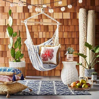 Transform your deck, porch or patio into a ocean-inspired oasis with this Minnows Outdoor Rug from Threshold™. This navy and white outdoor rug is constructed from stain- and water-resistant polypropylene to stand up to heavy foot traffic, and features a sturdy backing to prevent shifting and sliding. Brimming with seaside style, this geometric area rug features an attention grabbing minnow pattern to enhance the look of any interior space or outdoor area.